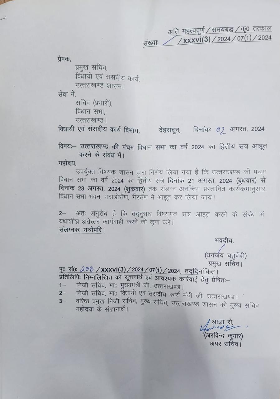 बता दें कि जिस तरह के दावे दिनों दिन हुए थे, उस दिन की कैबिनेट की बैठक में सत्र का समय और स्थान बनाने के लिए मुख्यमंत्री पुरुश सिंह धामी को नियुक्त किया गया था। टैब से सैटर्ली वॉल्यूम की तैयारी चल रही थी। शुक्रवार को सीएम ने तारीख तय कर दी।